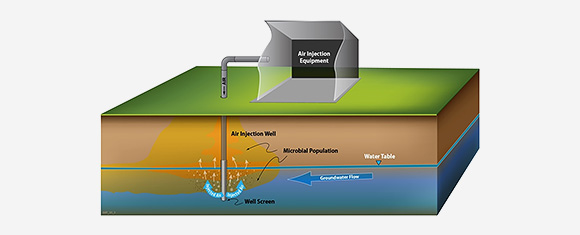 공기를 주입하여 생물학적 분해 유도(BV) 이중관정을 통해 자유상유류 / 오염지하수 /